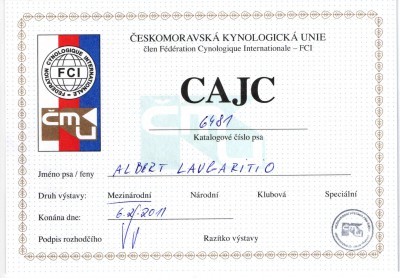 Na túto výstavu som išla so strachom, čo tam ten malý škriatok zas vymyslí a predvedie. Na moje milé prekvapenie sa správal vzorne, pekne chodil a dokonca sa nechal aj v kľude prehliadnuť na stole a na zemi pekne stál. Pani rozhodkyňa bola veľmi milá a trpezlivá. Albert sa jej zjavne páčil čo mňa veľmi teší.